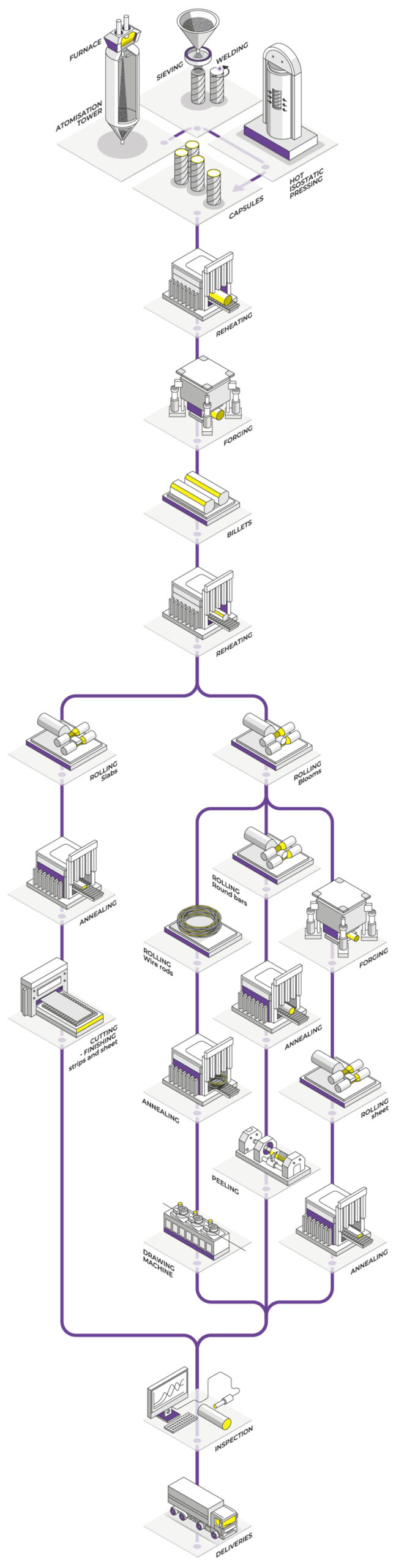 The molten steel is poured from a big tundish which allows to run down a fine jet of molten steel into an atomization chamber. At the top of the chamber the steel is fragmented into a shower of steel droplets by high-speed gas jets. When the droplets have reached the bottom of the chamber, they have solidified. Each powder grain (droplet) has the same chemical composition as a full size conventional ingot but the size has been reduced to less than one mm and the weight has at the same time been reduced from about 400 kg to 0,000004 kg. Reduction of the ingot size is the same as to reduce the segregation problem that limits the strength of the material. The powder is filled into metal cylinders (capsules) sealed by welding after vacuum evacuation. After preheating the cylinders are hot-isostatic pressed to full density billets. The final products are obtained after forging or rolling, heat treatments and final quality inspections.