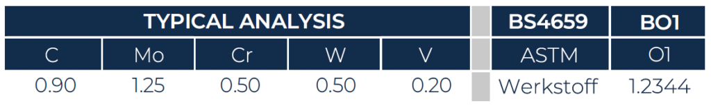 O1 is a standard oil hardening, carbon manganese tool steel possessing excellent dimensional stability in heat treatment. The vanadium content of O1 offers an advantage over other similar steels by promoting a uniformly fine grain size in tools of varying sections and by providing an added safeguard against the effects of overheating.